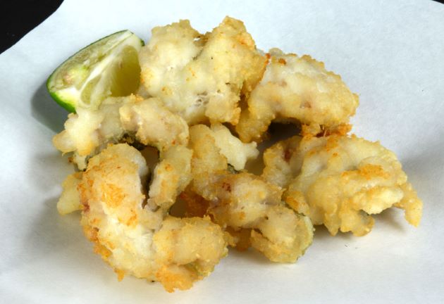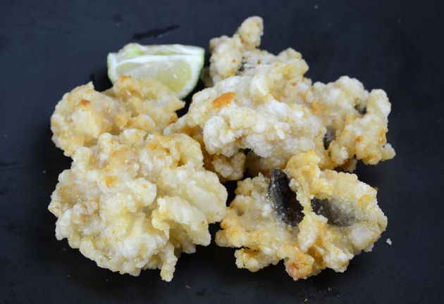 スズハモの唐揚げ 水洗いして開く。骨切りをして、切った身と身の間に片栗粉をまぶしつけていく。これを低温から揚げていく。じっくり揚がったら一度取りだし、今度は高温で揚げる。二度揚げするとサクッと香ばしくとても味わい深い。