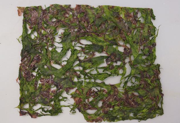 ハバノリのあぶり(セイヨウハバノリのあぶり) 板状のものをあぶると鮮やかな緑に変わる。くすんだ緑になる場合もあるが、味は変わらないと思う。磯(海藻)の香りが強く、このまま食べても香りと海藻のうまさが堪能できる。[島根県出雲市の「かしかめのり」]