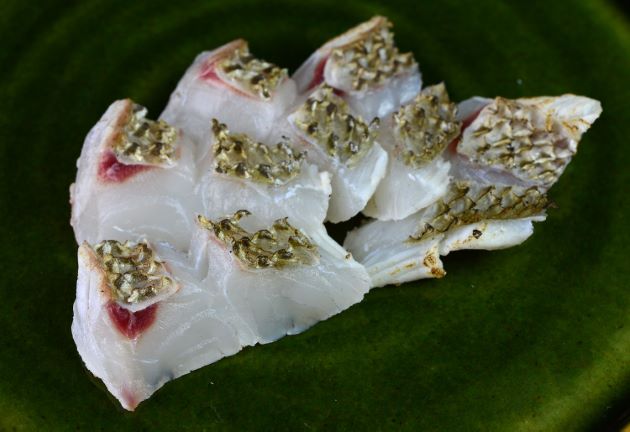セダカクロサギの焼霜造り 皮の色合いはヘダイなどに近い。味もよく似ていると思う。水洗いして三枚に下ろし、腹骨・血合い骨を取る。皮目を上にしてまな板にのせてあぶる。氷水に落として粗熱をとり、水分をよくきる。皮に豊かなうま味があり、薄い脂の層が皮下にある。クリックで閉じます![]()