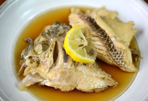 セダカクロサギのあら煮 腹部と頭部を煮つけにする。水洗いしてでたアラは適当に切り、湯通しする。水分をよくきり、酒・みりん・醤油・水を沸騰させた中であっさりと煮る。煮ても硬くならず柔らかい。身自体に甘みがあり、皮や骨周りに味がある。クリックで閉じます![]()