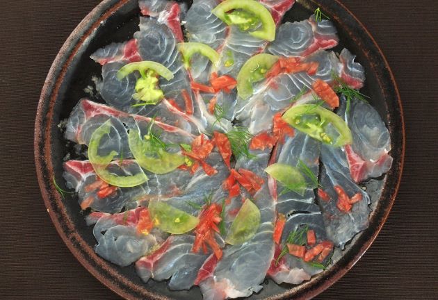 センネンダイのカルパッチョ 三枚に下ろして皮を引く。皿ににんにくをなすりつけてオリーブオイルを垂らす、塩コショウををする。。できるだけ薄く切りつけてさらに並べて行く。並べ終わったらスプーンなどでとんとんと馴染ませ上に好みの野菜などをのせて、塩コショウ、オリーブオイルをかけ回して出来上がり。クリックで閉じます![]()