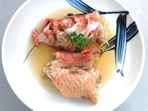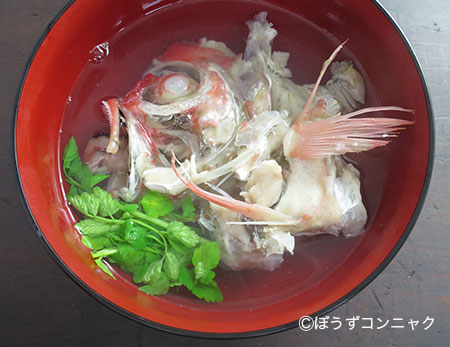 ソコアマダイの潮汁 潮汁は皮の甘味がだしに出て美味しい。名前通り、アマダイに近い味がするが、身はこちらの方が上かも。濃厚で味のいいだしが出るので、雑炊などにしてもいい。