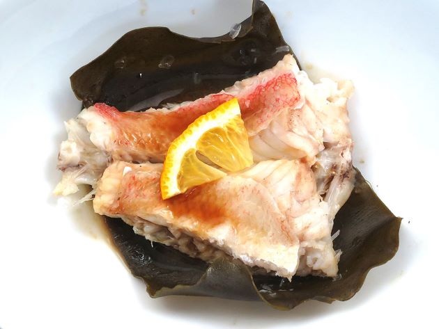 ソコアマダイの酒蒸し 三枚に下ろして振り塩をする。少し置き、水分を拭き取り、器にもどした昆布をしき、ソコアマダイの切り身を置き、酒を振り蒸す。