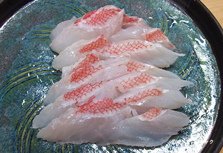 ソコアマダイの皮霜造り 身には味がなく、皮に味があるので、霜皮造りにして美味しい。皮に甘味と独特の風味がある。