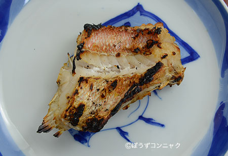 ソコアマダイの煮つけ 昆布だしで煮て、酒、みりん、薄口しょうゆで味つけしたもの。皮目の甘味、口に入れたときの風味がいい。身のほろほろと口の中でほどけるのもまたよし。煮た汁の味もよし、だ。