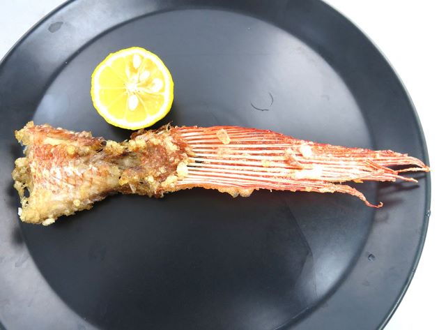 ソコアマダイの唐揚げ 身もいいが、鰭の香ばしさがよりいいので、尾鰭の部分を揚げる。