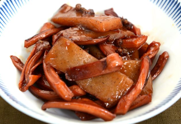 ソデイカと大根の煮物(アカイカと大根の煮つけ) 成イカのげそ、耳や幼イカを使う。成イカのげそなどは最初に酒と水で長時間下ゆでしておく。幼イカは適当に切る。大根は適当に切り、生米もしくは白水で下ゆでしておく。水分をよくきり、水・酒・砂糖・醤油を煮立てた中であくをすくいながら煮る。クリックで閉じます![]()