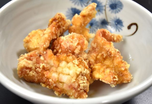 ソデイカの唐揚げ(アカイカの唐揚げ) 幼イカは柔らかすぎて、もろい。水洗いして水分を含んだ皮を剥く。水分をよく取り、片栗粉をまぶして揚げる。表面がさくっと揚がり、イカらしい風味も楽しめる。スナック菓子気分で楽しめる。クリックで閉じます![]()