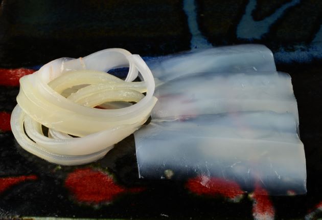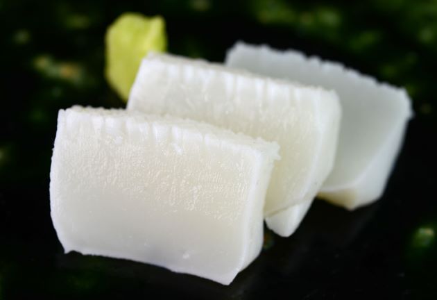 ソデイカの湯引き(アカイカの湯引き) 国産、兵庫県日本海側で揚がったものの冷凍ブロックを切りつけたもの。冷凍ブロックは解凍したら表面の水分をていねいに拭き取る。適当な大きさに切って塩水の中で湯通しし、氷水に落として粗熱を取る。水分をよくきり刺身状に切る。やや長めに熱を通しても中心部分は生の状態である。熱が通った部分の味わいと完全に生の部分の対比がいい。クリックで閉じます![]()