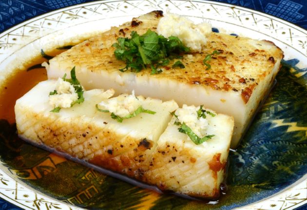ソデイカのあぶり 若い固体を水値して柔らかすぎる皮を剥く、適当に切れ目を入れて、酒・醤油を合わせた地につけ込む。1時間以上置き、水分をよく切りあぶる。じっくり焼くと水分が出て縮むので短時間火を通す。クリックで閉じます![]()