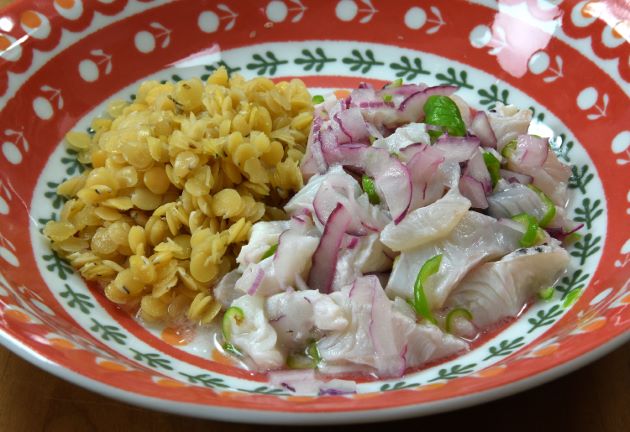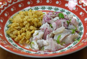 タカノハダイのセビチェ 刺身にした残りの尾に近い部分、内臓を抱き込む部分などを集めて置き小さく切る。これを塩・ライム(柑橘類などなんでもいい)・辛い青唐辛子・紫玉ねぎでマリネする。白く締まったら、そのままで、もしくは豆などお腹にたまるものと盛り付ける。クリックで閉じます![]()