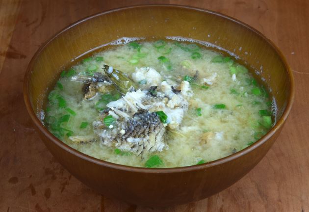 タカノハダイのみそ汁 あらを集めて置き、湯通しする。冷水に落として残った鱗やぬめりを流す。水分をよくきり、水から煮出してみそを溶く。非常にうま味豊かなみそ汁になる。臭みがあるときにはしょうがの搾り汁を。クリックで閉じます![]()