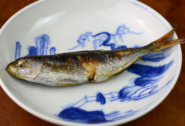 水洗いしてよく水分を拭き取っておく。振り塩をして少し寝かせる。脂が強いので短時間では塩が馴染まない。これをじっくりと炎が上がらないように焼き上げる。この脂のすすで汚れないように焼くのが肝心。初夏の塩焼きは絶品。東京では夏の塩焼きではイサキよりも珍重、多少高値でも食べたくなる。