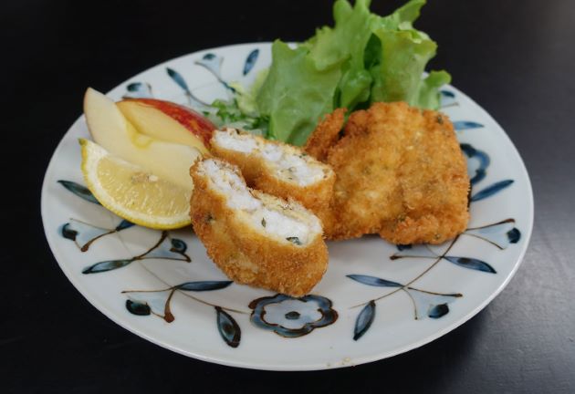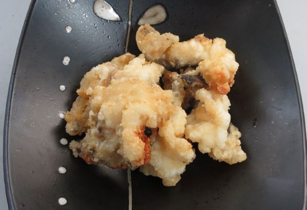 ダイナンアナゴのフライ ぬめりをこそげ落として開く。片身にして腹骨などを取り、できるだけ細かく骨切りする。水分をよく拭き取り、塩コショウして小麦粉をまぶして、溶き卵にくぐらせてパン粉をつけて揚げる。皮をつけると独特のうま味があり、皮を引くと食べやすい。クリックで閉じます![]()