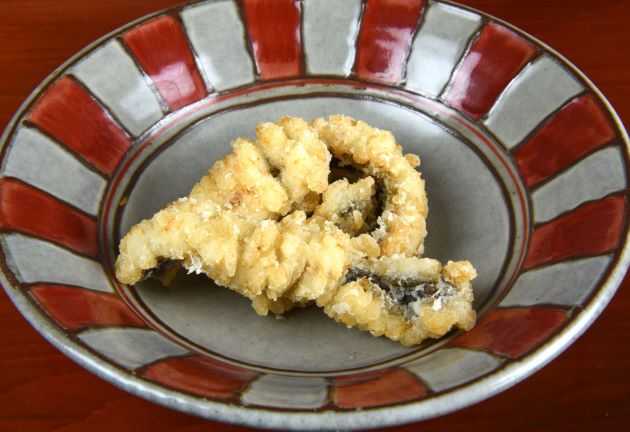 ダイナンウミヘビの唐揚げ 三枚に下ろして中骨(身)側から骨切りをする。これに片栗粉をまぶしてじっくり二度揚げする。香ばしくておいしいが、二度揚げしても骨が気になる。骨切りはハモ以上に難しい。クリックで閉じます![]()