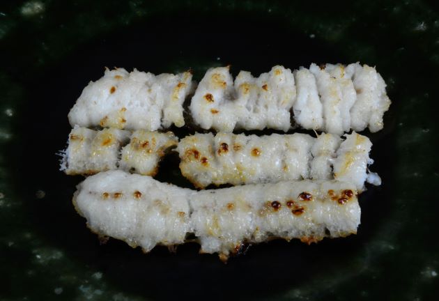 ダイナンウミヘビの煮つけ 頭部と内臓をあたりの部分を開いて煮つける。一度湯通しし、冷水に落としてしっかりぬめりを流す。水分をよくきり、酒・砂糖・しょうゆの味つけで煮る。筋肉に味がないので砂糖を使ったが、味つけはお好みで。