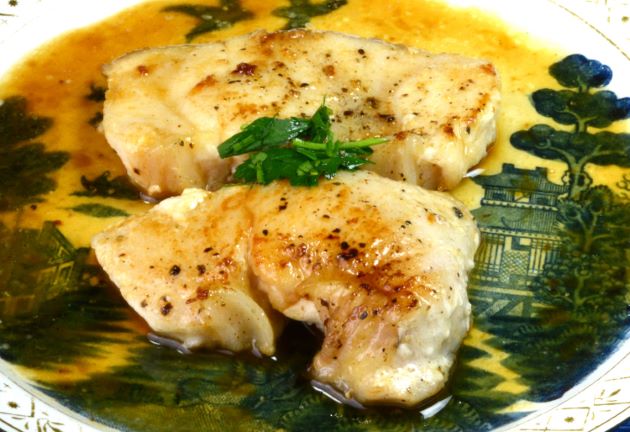 ダウリアチョウザメのステーキ 切り身にして塩コショウする。少し寝かせて水分をよく拭き取る。熱したフライパンでソテーする。仕上げにブランディーと醤油でフランベ。適度にしまり、食感は豚ロース肉を思わせる。魚らしいうまさもありとても味わいふかい。クリックで閉じます![]()