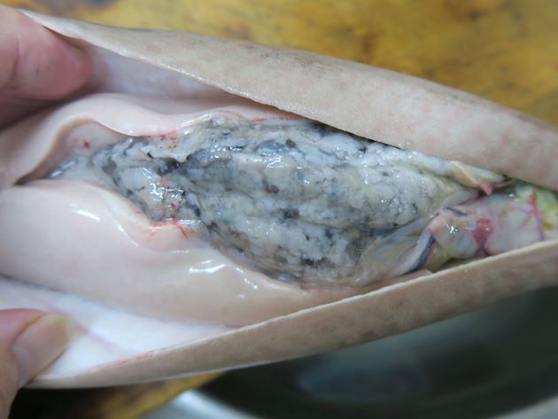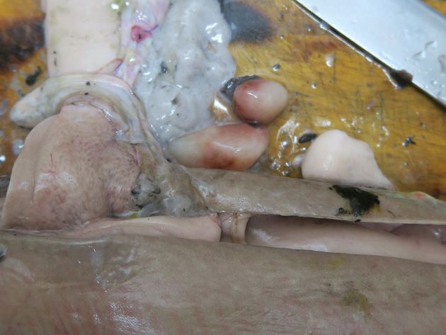 画像のものはメカジキやネズミザメなどの大形魚を獲物とする大目流し網で揚がったもの。ダルマザメはこのメカジキやサメなど大型魚を襲い、筋肉を噛み取り餌としているので、獲物に襲いかかっている最中に刺し網にからまって捕まったようだ。