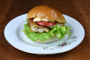 チャネルキャットフィッシュのハンバーガー(アメリカナマズのハンバーガー) フライはご飯にも合うが、ハンバーガーにするとランチにもなる。野菜をたっぷり合わせると、ボリューミーでうまい。クリックで閉じます![]()