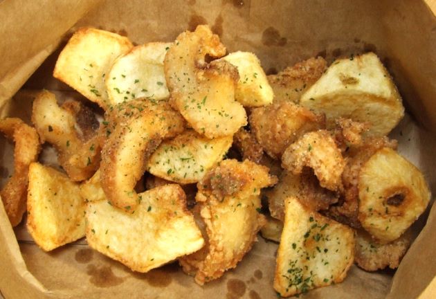 チャネルキャットフィッシュのムニエル(アメリカナマズのムニエル) 適当に切り、塩コショウして小麦粉をまぶしておく。これを衣(小麦粉・卵黄・ビール・酢)をからめてジャガイモと一緒に揚げる。香ばしい衣に締まった身で万人向きの味わいだ。クリックで閉じます![]()