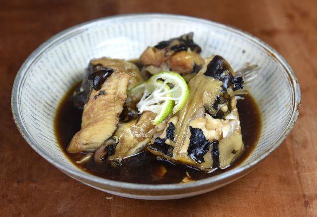 チャネルキャットフィッシュの煮つけ(アメリカナマズの煮つけ) 水洗いして適当に切る。湯通しして冷水に落としてぬめりを流す。これを酒・醤油、しょうがでじっくりと煮る。みりん、砂糖などで甘味をつけてもいい。煮ても硬く締まらず、ナマズよりもあっさりしている。食べやすい。クリックで閉じます![]()