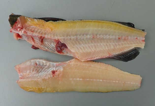 チャネルキャットフィッシュのムニエル(アメリカナマズのムニエル) 上品な白身だけど、単にソテーしても味わいに欠ける。これをバターで補う。三枚に下ろして腹骨を取り、皮を引く。振り塩をして少し置き、表面の水分をとる。小麦粉をまぶして油で香ばしくソテー、仕上げにバター(マーガリン)で風味づけする。クリックで閉じます![]()