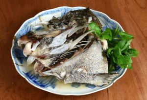 チョウチョウコショウダイの兜煮 水洗いして落とした頭部を半割にする。湯通しして冷水に落として鱗や滑りなどを流す。よく水切りして酒、砂糖、しょうゆ、水で煮る。酒、塩や酒、みりん、しょうゆで味つけしてもいい。思った以上に身がつき、皮目もおいしい。クリックで閉じますチョウチョウコショウダイの兜煮