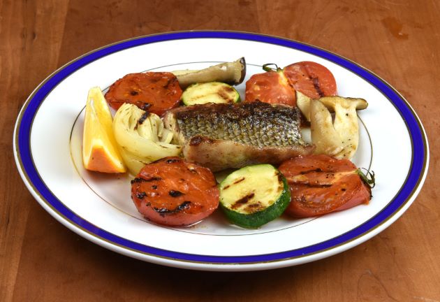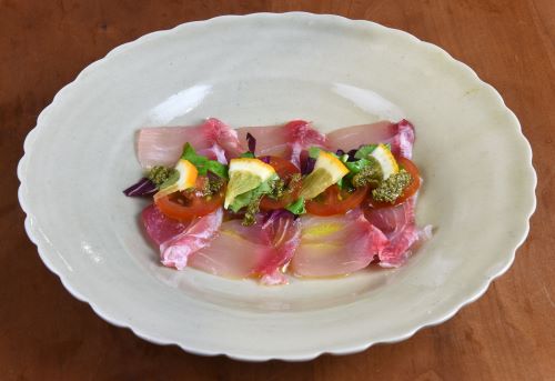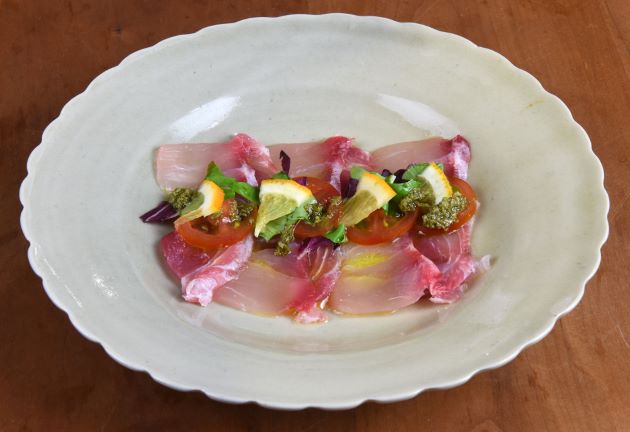 チョウチョウコショウダイのカルパッチョ 最近はほとんど刺身といったものでもイタリア的なものは、カルパッチョと呼ぶので、ここではそれに従う。薄切りにしてにんにくをなすりつけた皿にオリーブオイルを敷いて切り身を並べる。上から香りのある野菜、トマトなどをのせて柑橘をふり、オリーブオイルを再度かける。塩分が欲しいときは上からも振る。やや硬めの身質なので刺身よりもカルパッチョなどに向くように思う。