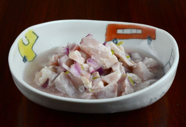 チョウチョウコショウダイのセビチェ 刺身などにして使いにくい端や尾に近い部分、腹側の薄い身を使うと合理的。これを小さく切り、玉ねぎ、塩とライムジュース(市販品の100パーセントのもの)、辛い唐辛子と和える。このときお好みの野菜、例えばトマトやセロリなどを加えてもいい。爽やかな味わいでスピリッツに合う。クリックで閉じます![]()