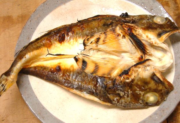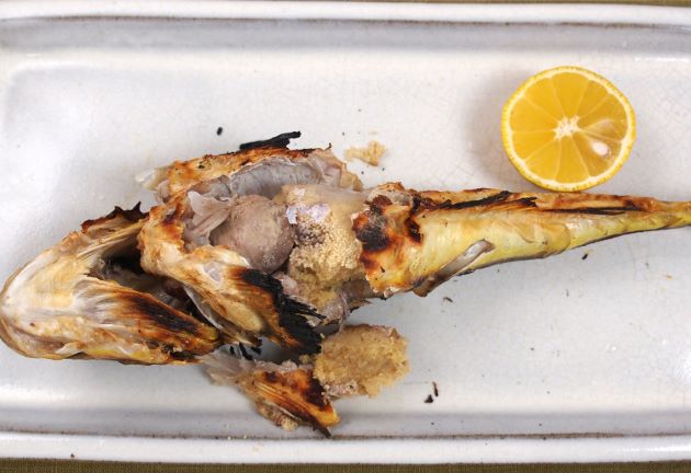 ツマグロカジカの塩焼き 水洗いして、腹にまず振り塩をして、そこに真子と肝だけ腹にもどす。全体に振り塩をして1時間ほど寝かせてじっくりと焼き上げる。身は鶏肉のようにしまり、やや硬いが味はいい。本種の卵巣は卵粒が細かく味がある。クリックで閉じます![]()