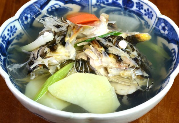 ツマグロカジカの三平汁 食べる部分はあまり多くはないが骨などからとてもいいだしが出る。これで大根やにんじん、じゃがいもなどを煮て食べるのが三平汁である。北海道の郷土料理で様々な魚、様々な野菜で作る。