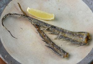 テナガダラの唐揚げ 尾は無駄に長いようにも思えるが、揚げるとさくさくと香ばしく面白い味わいになる。尾は単純に切り落とす。ウロ尾などはそのままに水分をよくきり、片栗粉をまぶしてじっくりと二度揚げにする。長い分、食べ応えがあって非常においしい。クリックで閉じます![]()