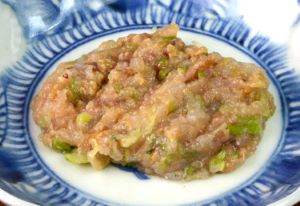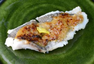 テナガダラの肝みそ焼き 水洗いして三枚に下ろす。片身に弱い振り塩をする。水分が出て来たらていねいに拭き取る。肝はみそ・みりんと一緒にして叩いておく。身をじっくりと表面に焼き色がつくまで焼き上げる。焼き上がりに肝みそをのせて仕上げる。クリックで閉じます![]()