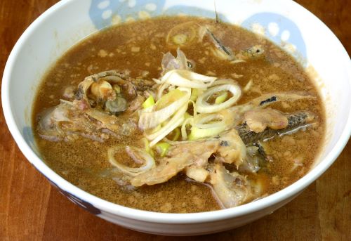 水洗いして肝を取り分けて置く。頭部や中骨などは適当に切り、湯通しして鱗などはこそげ落とす。水分をよくきり、水から煮出してみりんを少量加え、白みそ、八丁みそをすり鉢ですり、肝も加えて吸ったものを溶き入れる。