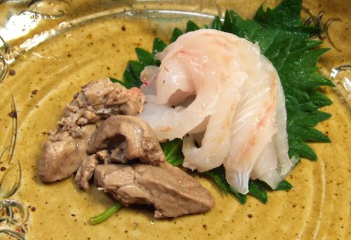 トウジンの刺身 鮮度がよければ刺身になる。水洗いして三枚に下ろして皮を引く。柔らかい身だがうま味と甘味があっておいしい。ただしこれだけでは平凡だ。肝をつけて肝じょうゆ、肝と合わせて食べるとやたらにうまい。クリックで閉じます![]()
