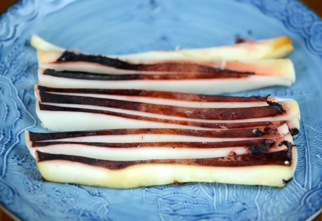 トビイカの一夜干し 水洗いして外套膜(胴)の部分を立て塩にする。30分ほどつけて水分をよくきり、半日干す。焼くとスルメイカよりも硬いものの、イカの風味は豊かで味わい深い。とてもおいしい一夜干しである。