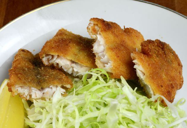 ドクウロコイボダイのフライ 鱗をつけたまま三枚に下ろす。鱗ごと皮を引き、腹骨・血合い骨を取る。塩コショウして小麦粉をまぶし、衣(卵・小麦粉・少量の水・少量の油。溶き卵でもいい)をからめ、パン粉をつけて高温で揚げる。熱を通すことで適度に筋肉内の脂がとけくどさが消える。食べやすく、冷えてもおいしい。クリックで閉じます![]()