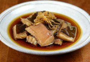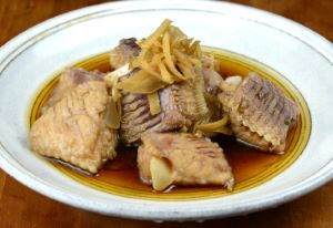 ドブカスベの煮こごり 本種などガンギエイ類は煮ると見事な煮凝りができる。多めの煮汁で煮て冷まし、型に入れて冷やす。味付けは甘めにした方がご飯に合う。また冷たい煮つけとしてもとても味わい深い。クリックで閉じます![]()