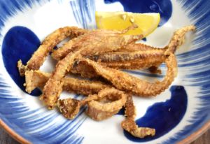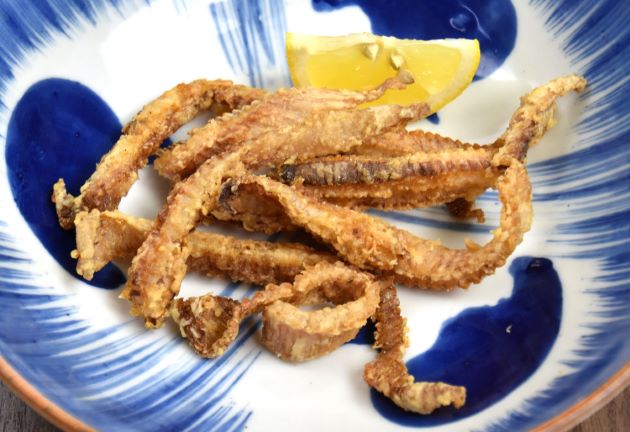 ドブカスベの唐揚げ 市販のものはすでに剥いてあるが、丸のままの状体なら鰭の部分を切り取り、皮を剥く。軟骨を切らないように横方向に適当にきり、再度水分を拭き取り、小麦粉をまぶしてじっくりと二度揚げする。さくっとして、中心部分にこくのあるエキスが感じられる。非常においしい。クリックで閉じます![]()