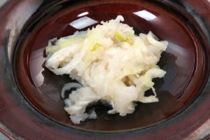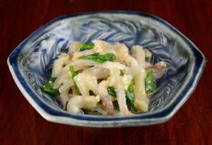 ドブカスベの酢みそ和え 鰭を切り放し、軟骨を切らないように切り分ける。適当な長さに切り、さっと湯通し、冷水に落として水をきる。これとゆでたわけぎ、酢みそを合わせて和える。こりこりとした軟骨の食感、噛むと染み出してくる甘味、酢みその爽やかな味があいまってとても美味。クリックで閉じます![]()