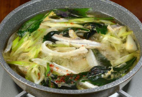 ドブカスベの韓国風鍋 鰭の部分を横方向、軟骨を切らないように切る。これを軽く湯通しして冷水に落として水分をきる。これを煮干しだし(動物性のだしならなんでもいい)、酒少々、塩の中で煮ながら食べる。軽く温めるくらいでもこりこりしておいしい。野菜は好みのものを、唐辛子は好みで加える。クリックで閉じます![]()