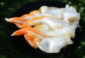 ナガザルの刺身 完全な生と湯引きの違いがわかりにくい。写真は剥き身にして足を開いて塩水で洗う。水分をよく切っただけのもの。二枚貝によっては生臭いものもあるが、本種にまったく臭味がない。湯引きほど食感は分かりやすくないが、表面がまったく生も悪くない。クリックで閉じます![]()