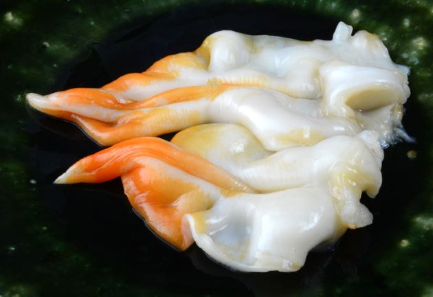 ナガザルの湯引き 基本的に生で食べるのは足の部分だ。トリガイやエゾイシカゲガイと同様、とても豊かな甘味があり食感が心地よい。二枚貝の中でもトップクラスの味である。