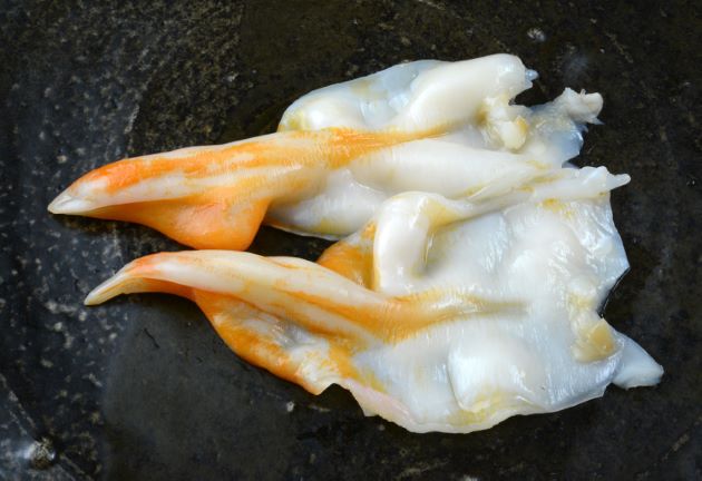 剥き身にする。足だけにして、足を開く。中にある内臓部分をしごき出す。これを塩を加えた湯の中に通す。氷水に落として水分を切る。トリガイほどではないが、足の色素はとれやすいので要注意。