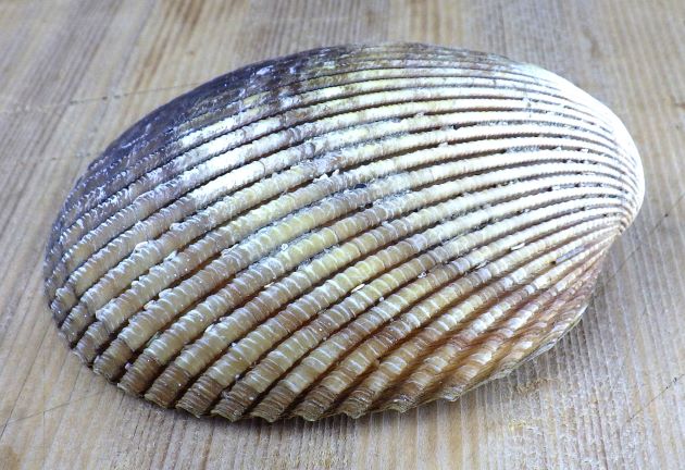殻高10cmを超える。卵形で膨らみが強い。放射肋(縦縞)が非常に強く40本前後ある。