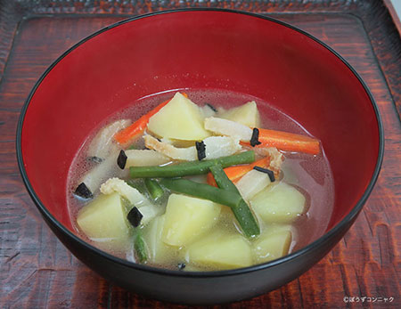 いるか汁(くじら汁)●新じゃがいもと、ささげ(いんげん)、塩皮クジラの汁。塩皮クジラを煮すぎないのがコツ。[庄司平吉商店 山形県山形市東原町]