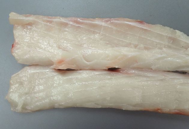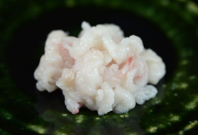 ナガタチカマスの刺身 三枚に下ろして皮目に近い方は強い骨が埋まっているので、切り離す。中骨に近い部分のみ刺身にできる。脂は身に混在して白濁していて、全体に柔らかい。口に入れると口溶け感があり非常に甘く感じる。魚らしいうま味もあり、絶品である。クリックで閉じます![]()