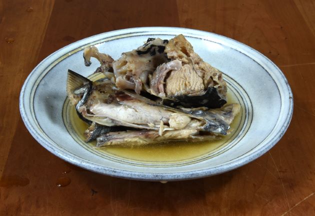 ナガタチカマスのあら煮(煮つけ) 頭部やかまの部分を適当に切る。湯通しして冷水に落として血液やヌメリを流す。これを酒・しょうゆ・水であっさり煮上げたもの。砂糖、みりんで甘味を加えてもいい。身、皮は口のなかでほろほろと崩れ、脂が甘みに感じられる。非常にうまい。煮汁もいい味なのでそうめんなどをつけて食べる。骨湯にしてもいい。クリックで閉じます![]()
