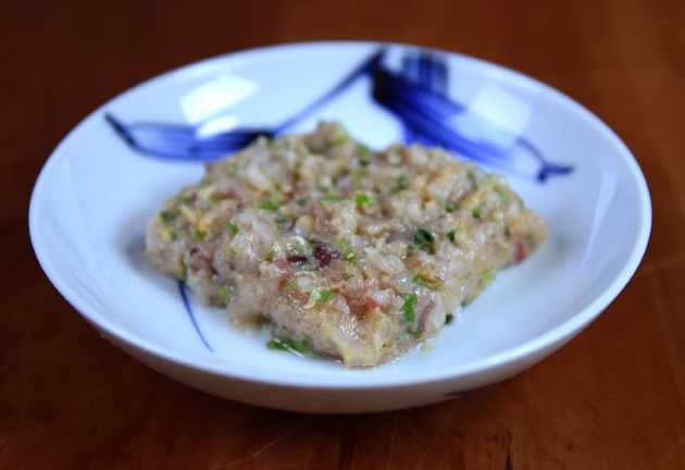 ナガタチカマスのみそたたき(なめろう) 皮に近い部分は脂がのっているが、骨がある。これをスプーンでかき出す。ねぎ、みょうが、大葉などとみそと一緒に包丁でたたく。少しねっとりするくらいにたたいて出来上がりだ。脂がのってい口に入れるととろっととろける感じがする。端的なおいしさで酒にもご飯にも合う。クリックで閉じます![]()