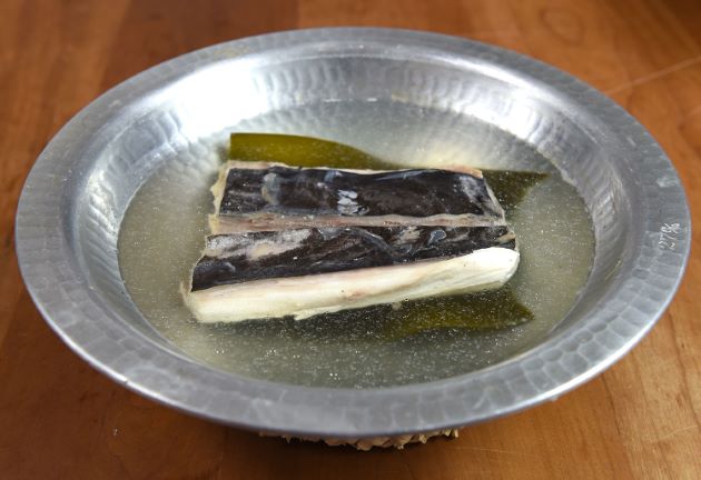 ナガタチカマスの酒塩煮 切り身を昆布と塩を加えた中でゆっくり火を通す。煮立てると切り身からうま味が出てしまうので、できるかぎり一定の温度で煮立たせないで煮上げるのがコツ。煮上がったら煮汁と一緒に食べる。脂がのっている身は柔らかく、煮汁と一緒に食べるととろけるようだ。クリックで閉じます![]()
